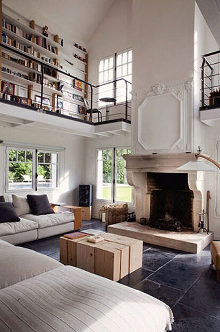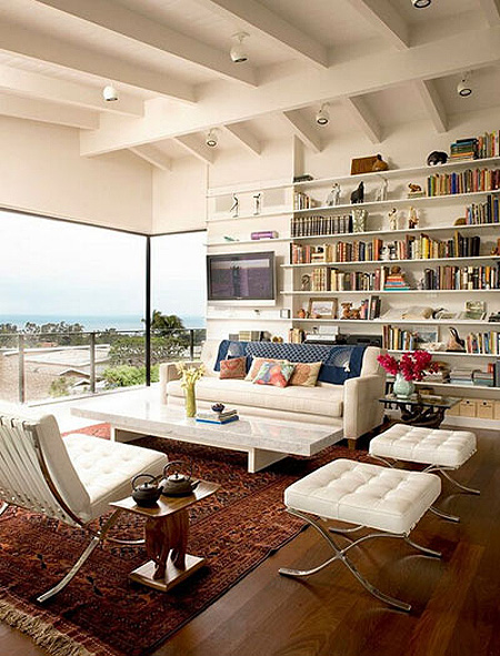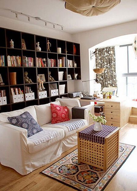 小编的话:同样在客厅中以大面积书架储物墙来作为沙发背景的设计,使这间看起来不算大的客厅空间显得十分实用,客厅一旁的地台设计也为整间客厅增色了不少。