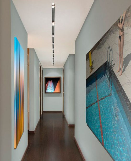 这是很多家里常见的过道样式,短促且偏窄。地板颜色跟墙壁色调搭配起来,真是绝配,白色大幅的装饰画,让墙壁呈现更多装饰元素。