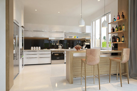 设计重点:吧台+拉长式吊灯设计 编辑点评:吧台搭配拉长式吊灯,一上一下,相互呼应,共同起到挑高空间的作用。墙壁上的陈列架增加了空间收纳功能,提高了居家环境的实用性。