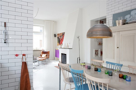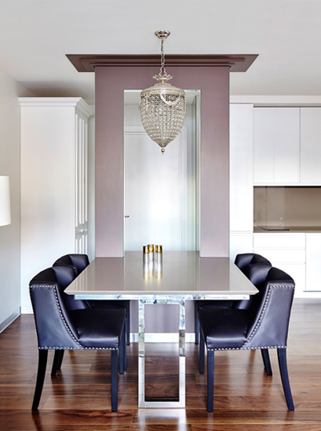 设计重点:餐桌椅搭配 编辑点评:线条硬朗的立体亮面餐桌搭配柔软舒适的皮艺餐椅,二者的组合巧妙地中和了质感,创造出优雅时尚的餐厅环境。 |