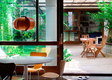 设计重点:半封闭空间 编辑点评:与常见的开放式餐厅不一样,该餐厅置身于狭窄的半封闭空间里;角落的橱柜占用了背景墙,集收纳、展示与餐具洗涮三大功能,十分方便实用,其亮面外观也在视觉上扩大了餐厅的空间感。