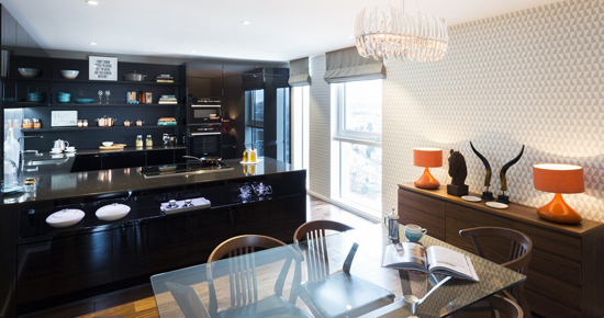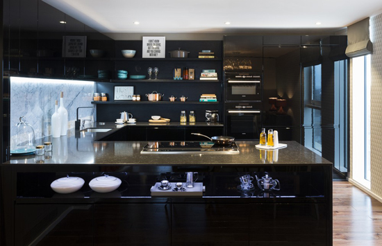 装修TIPS:纯黑色的开放式厨房,非常时尚。同时搭建了很多台面,便于放置厨房用具。这些台面也是摆放装饰品的好地方,搭配射灯效果,时尚感倍增。