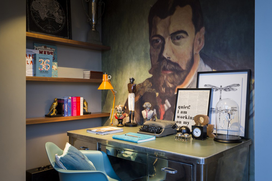 装修TIPS:书房的设计,如果不是非要办公需要很大的桌子,像这样的小桌也是很好的选择。房间内的墙上以人像画为基底,非常适合在这里读一本好书。