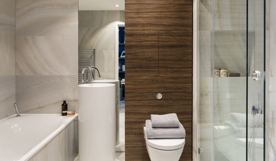 装修TIPS:白色的浴盆搭配大理石纹理墙面,优雅而简单。洗手台是有设计感的圆柱形,个性十足。