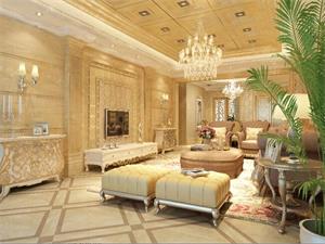 欧式风格给人的感觉就是高贵、华丽。确实,单看这款效果图的地毯、沙发就已经显示出来它的华丽了。我们不得不为这个客厅吊顶、水晶吊灯而感到有一种成...