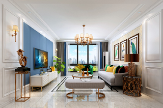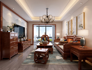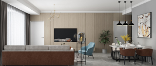 传统与时尚结合,用低饱和度色系的软装,搭配饱和度较高的柚木色...