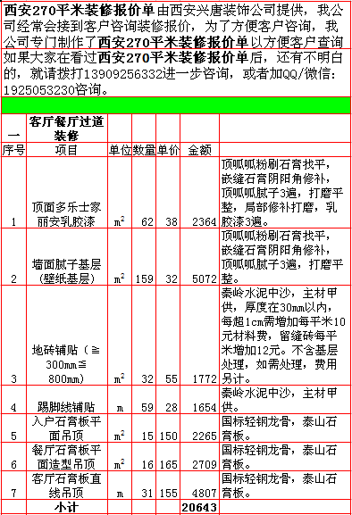 西安兴唐装饰公司2018年西安270平米半包装修报价表,一次性报价,后期零增项,多退少不补,专业半包,自有江苏扬州工人,不转包,做工精细,超长质保,水电保修10年,整体保修5年。咨询手机/微信13909256332.