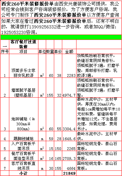 西安兴唐装饰公司2018年西安260平米半包装修报价表,一次性报价,后期零增项,多退少不补,专业半包,自有江苏扬州工人,不转包,做工精细,超长质保,水电保修10年,整体保修5年。咨询手机/微信13909256332.
