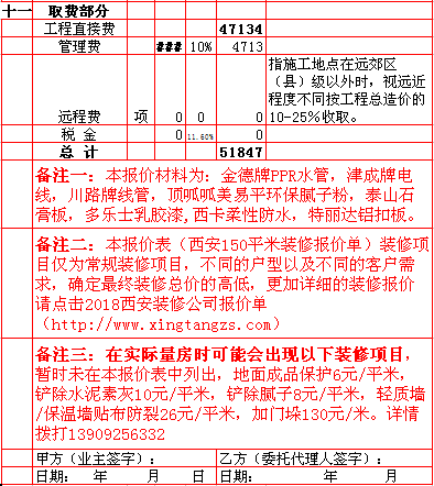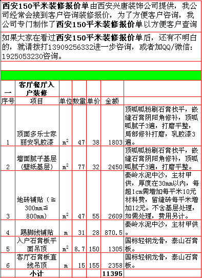 西安兴唐装饰公司2018年西安150平米半包装修报价表,一次性报价,后期零增项,多退少不补,专业半包,自有江苏扬州工人,不转包,做工精细,超长质保,水电保修10年,整体保修5年。咨询手机/微信13909256332.