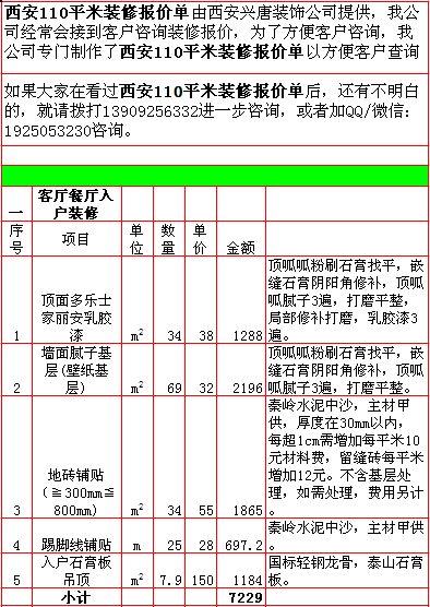 西安兴唐装饰公司2018年西安110平米半包装修报价表,一次性报价,后期零增项,多退少不补,专业半包,自有江苏扬州工人,不转包,做工精细,超长质保,水电保修10年,整体保修5年。咨询手机/微信13909256332.