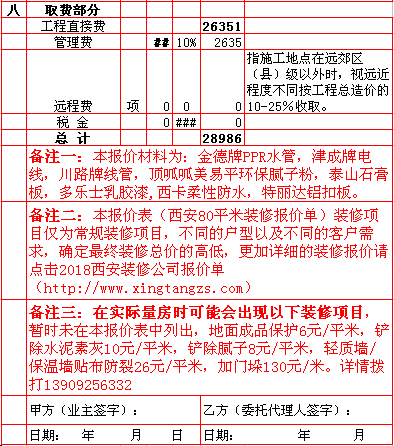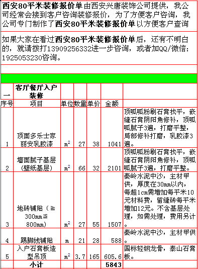 西安兴唐装饰公司2018年西安80平米半包装修报价表,一次性报价,后期零增项,多退少不补,专业半包,自有江苏扬州工人,不转包,做工精细,超长质保,水电保修10年,整体保修5年。咨询手机/微信13909256332.