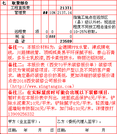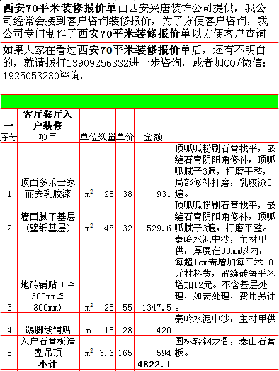 西安兴唐装饰公司2018年西安70平米半包装修报价表,一次性报价,后期零增项,多退少不补,专业半包,自有江苏扬州工人,不转包,做工精细,超长质保,水电保修10年,整体保修5年。咨询手机/微信13909256332.