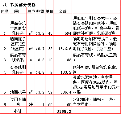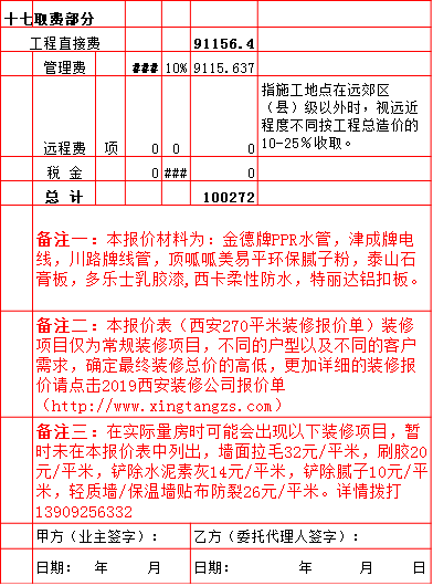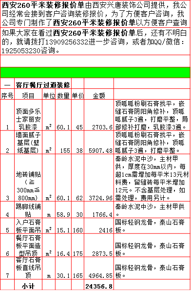 2019年西安260平米半包装修预算费用报价表西安兴唐装饰公司提供,我公司经常会接到客户咨询装修报价,为了方便客户咨询,我公司专门制作了2019年西安260平米半包装修预算费用报价表以方便客户查询。我公司西安首家实行“先装修后付款”的人性化的付款新模式,专业半包,自有江苏扬州工人不转包,材料由公司统一配送,价格优惠零增项,一次性报价,多退少不补,如果有什么不明白的,就请拨打13909256332进一步咨询或者加QQ/微信:1925053230咨询。