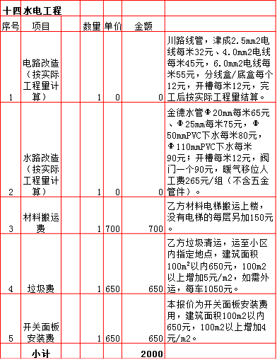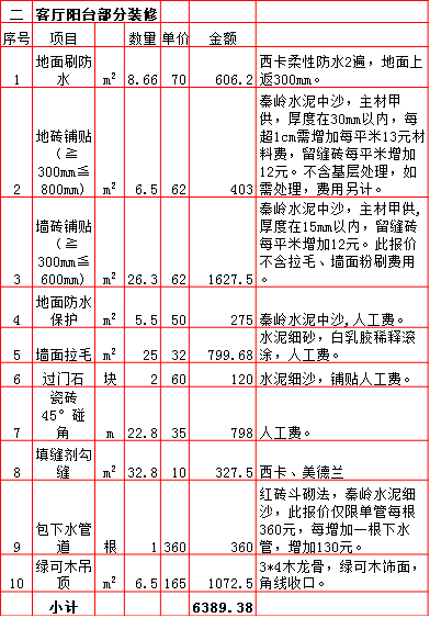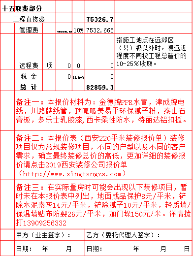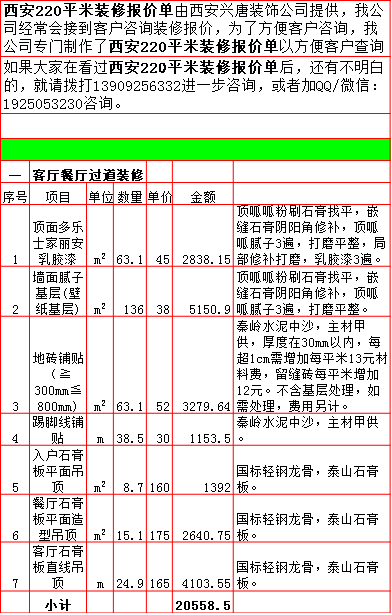 2019年西安220平米半包装修预算费用报价表西安兴唐装饰公司提供,我公司经常会接到客户咨询装修报价,为了方便客户咨询,我公司专门制作了2019年西安220平米半包装修预算费用报价表以方便客户查询。我公司西安首家实行“先装修后付款”的人性化的付款新模式,专业半包,自有江苏扬州工人不转包,材料由公司统一配送,价格优惠零增项,一次性报价,多退少不补,如果有什么不明白的,就请拨打13909256332进一步咨询或者加QQ/微信:1925053230咨询。 点击返回半包装修报价频道
