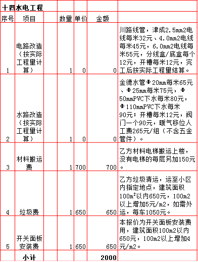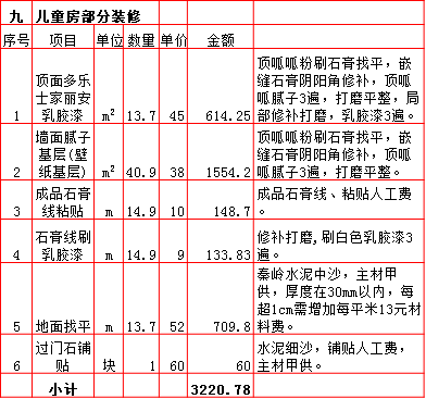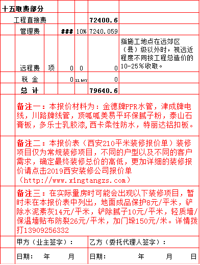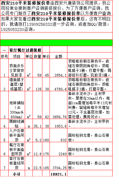 2019年西安210平米半包装修预算费用报价表西安兴唐装饰公司提供,我公司经常会接到客户咨询装修报价,为了方便客户咨询,我公司专门制作了2019年西安210平米半包装修预算费用报价表以方便客户查询。我公司西安首家实行“先装修后付款”的人性化的付款新模式,专业半包,自有江苏扬州工人不转包,材料由公司统一配送,价格优惠零增项,一次性报价,多退少不补,如果有什么不明白的,就请拨打13909256332进一步咨询或者加QQ/微信:1925053230咨询。