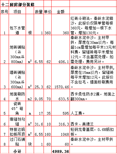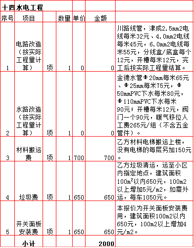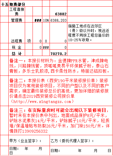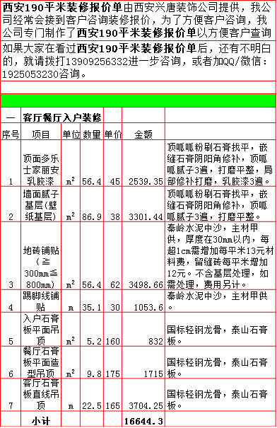 2019年西安190平米半包装修预算费用报价表西安兴唐装饰公司提供,我公司经常会接到客户咨询装修报价,为了方便客户咨询,我公司专门制作了2019年西安190平米半包装修预算费用报价表以方便客户查询。我公司西安首家实行“先装修后付款”的人性化的付款新模式,专业半包,自有江苏扬州工人不转包,材料由公司统一配送,价格优惠零增项,一次性报价,多退少不补,如果有什么不明白的,就请拨打13909256332进一步咨询或者加QQ/微信:1925053230咨询。 点击返回半包装修报价频道