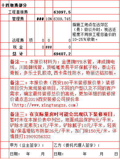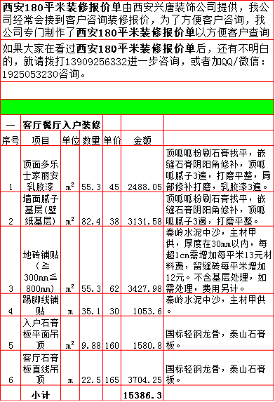 2019年西安180平米半包装修预算费用报价表西安兴唐装饰公司提供,我公司经常会接到客户咨询装修报价,为了方便客户咨询,我公司专门制作了2019年西安180平米半包装修预算费用报价表以方便客户查询。我公司西安首家实行“先装修后付款”的人性化的付款新模式,专业半包,自有江苏扬州工人不转包,材料由公司统一配送,价格优惠零增项,一次性报价,多退少不补,如果有什么不明白的,就请拨打13909256332进一步咨询或者加QQ/微信:1925053230咨询。
