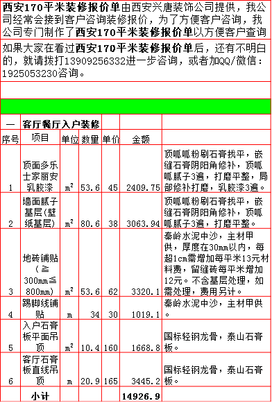 2019年西安170平米半包装修预算费用报价表西安兴唐装饰公司提供,我公司经常会接到客户咨询装修报价,为了方便客户咨询,我公司专门制作了2019年西安170平米半包装修预算费用报价表以方便客户查询。我公司西安首家实行“先装修后付款”的人性化的付款新模式,专业半包,自有江苏扬州工人不转包,材料由公司统一配送,价格优惠零增项,一次性报价,多退少不补,如果有什么不明白的,就请拨打13909256332进一步咨询或者加QQ/微信:1925053230咨询。